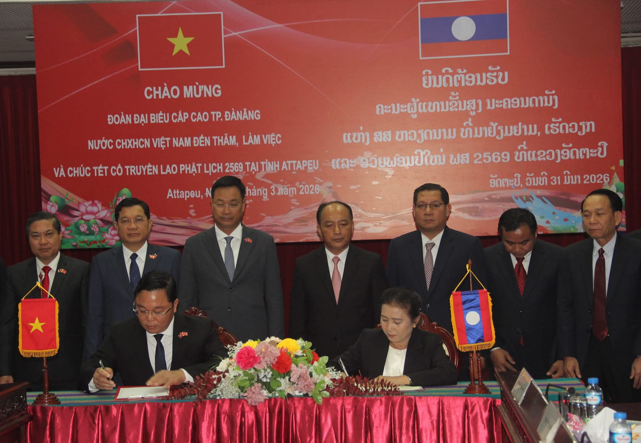 ພິທີລົງນາມບົດບັນທຶກຊ່ວຍຈໍາການຮ່ວມມື ລະຫວ່າງ ຄະນະກຳມະການອົງການປົກຄອງ ແຂວງອັດຕະປື ສປປ ລາວ ແລະ ຄະນະກຳມະການປະຊາຊົນ ນະຄອນດານັງ ສສ ຫວຽດນາມ ໄດ້ຈັດຂື້ນຢ່າງເປັນທາງການໃນວັນທີ 31 ມີນາ 2026 ທີ່ຫ້ອງວ່າການປົກຄອງແຂວງອັດຕະປື, ຝ່າຍແຂວງອັດຕະປື ມີສະຫາຍ ບຸນເຖິງ ດວງສະຫວັນ ກຳມະການສູນກາງພັກ ເລຂາພັກແຂວງອັດຕະປື ພ້ອມຄະນະພັກ ຄະນະນໍາຂອງແຂວງ ແລະ ຝ່າຍນະຄອນດານັງ ມີ ສະຫາຍ ເລ ງັອກ ກວາງ ກຳ ມະການສູນກາງພັກກອມມູນິດຫວຽດນາມ ເລຂາພັກ ແຂວງນະຄອນດານັງ ພ້ອມຄະນະພັກ ຄະນະນໍາທັງສອງຝ່າຍເຂົ້າຮ່ວມ.