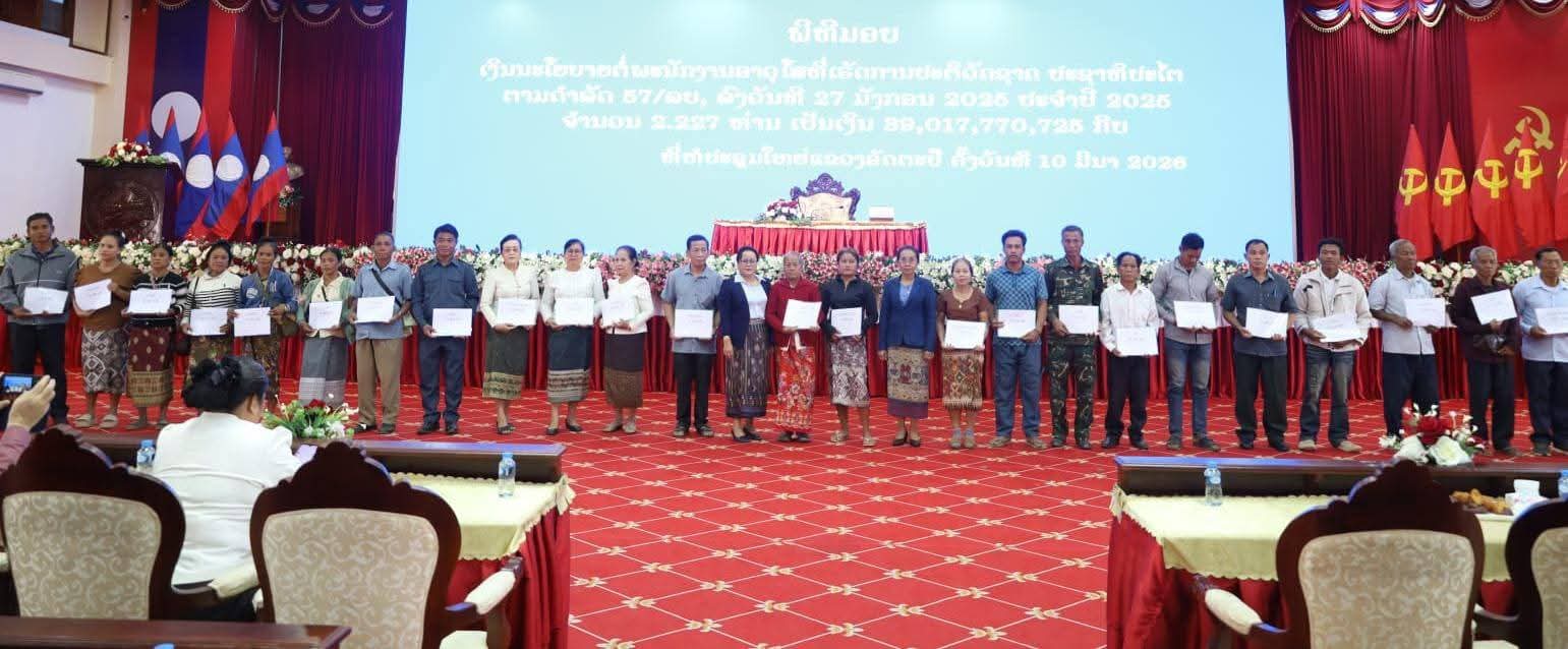 ໃນວັນທີ 10 ມີນາ 2026 ທີ່ຫໍປະຊຸມໃຫຍ່ຂອງແຂວງອັດຕະປື ໄດ້ຈັດພິທີມອບເງິນນະໂຍບາຍຕໍ່ພະນັກງານທີ່ເຮັດໜ້າທີ່ການປະຕິວັດ ຕາມດຳລັດ 57/ລບ, ປະຈໍາປີ 2025 ຈໍານວນ 2,227 ທ່ານ, ມູນຄ່າ 39 ຕື້ກວ່າກີບ, ໂດຍເປັນກຽດເຂົ້າຮ່ວມຂອງ ທ່ານ ນາງ ມີນາພອນ ໄຊຊົມພູ ຮອງເລຂາພັກແຂວງ, ມີພະແນກການທີ່ກ່ຽວຂ້ອງຂອງແຂວງ, ເມືອງ ພ້ອມດ້ວຍຍາດພີ່ນ້ອງຂອງຜູ້ເສຍຊີວິດເຂົ້າຮ່ວມ.
